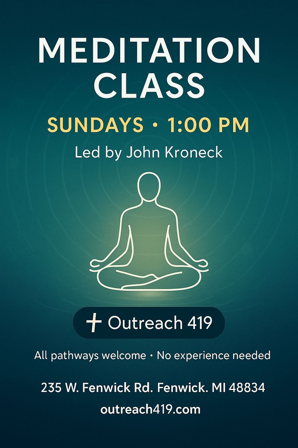 Feeling scattered? Hit reset with our weekly Meditation Class—Sundays at 1pm with John Kroneck at Outreach 419.